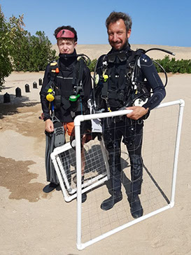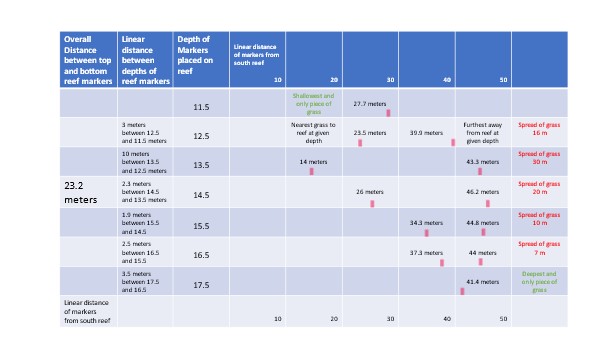 The ethos behind Open Ocean Science Centres are ‘citizen science’ projects. Volunteers are drafted in to carry on research started by Universities and to continue with the data collection which will be fed back, thus carrying on the research which would otherwise be impeded by a lack of continuity. One such project, was to measure a sea grass bed which has recently grown in the Open Ocean House Reef, Abu Sauatir. We were asked if we would like to take on the sea grass project, and indeed we were, so me, Gerald Taylor and my 13 year old son, Finlay, began the planning. We both had the prerequisite diving skills – Finlay in fact, despite his age, came to Roots with 100 dives already under his belt. It was a month long exercise at Roots that would give Finlay, who has an exceptionally keen interest in the underwater world, real life experience working and living in a foreign country, and an understanding of marine biology project work. Coupled with the project, Finlay worked with the marine biologists at Open Ocean carrying out fish and coral ID and measuring / monitoring techniques. The objective of the project set was to measure the perimeter/extremities of the sea grass within the bay and to gain an understanding of its shape, distribution, density and what lives within it. Together we formulated a method by which we would be able to measure the perimeter of the sea grass. The starting point then was to undertake land based measuring techniques using 50 meter transects and quadrats, with the full knowledge that stretching a tape underwater to a distance of nearly 50 meters would have its complications. Two methods of measurement were undertaken. The first was a depth analysis – to assess the shallowest and deepest depths of the seagrass and range of its growth. This also incorporated the width of the sea grass at given depths. Following on from this, because a meter depth range is not the same as a linear meter in distance, we measured the linear distance between the depth markers to get the gradient. From the data collected, the shallowest sea grass occurred at 11.5 m depth on the given day of measurement; the deepest sea grass was at 17.5 m depth. Markers were placed at each meter depth interval in-between. The linear distance between the shallowest and deepest growth at 11.5 and 17.5 meters deep was 23 meters, and from this we found out that the greatest linear distance was between 13.5 and 12.5 depths - 10 meters long – not only the shallowest gradient but also the area of most growth. The width of the growth at 13.5 meters depth was 30 linear meters wide. Due to the natural inaccuracies associated with the use of depth, we approached our second measurement method. We started by using the widest part of the sea grass at the 13.5 m depth marker, determined from the previous study and used the centre of this to create an x-y axis. We marked out and laid a horizontal line (the x axis) and 90˚ to this we laid a vertical line (the y axis). We had now divided the sea grass patch into four quadrants, labelled Q1, Q2, Q3 and Q4. For each quadrant, we put markers in the ground at changes in direction – as our brief was to measure the perimeter / extremities of the sea grass. At each marker, we obtained dimensions on both the x and y axis, ensuring the measuring line was kept at 90˚ to the tape measure at all times to guarantee as much accuracy as possible. Once the data had been collected within the four quadrants – that is the position of markers at 70 different points, we could graphically represent each quadrant. Following on from this, we carried out a density analysis within each quadrant – placing quadrats in random positions, making notes of the positions for future comparison, and taking photographs. We also assessed the visible life within each quadrant. Amazingly, the sea grass, although perhaps only 25 mm tall, had already attracted ghost pipe fish, making it abundantly clear how ecologically important the grass is and how certain species are naturally drawn to habitat within it. With the exercise complete, this benchmark study was been forwarded to Open Ocean and the information is now accessible to all volunteers and visiting University students. The aim is for volunteers and researchers to compare and contrast this data over time and to ascertain whether the sea grass is expanding or contracting. In doing this, comparable data will be obtained over the years to monitor the health of the sea grass and the fauna that lives within it. Gerald Tayor 2nd Nov 2023 Summary of the depth method, which gave us an indication of the width of the sea grass and growth extremities. SEa Grass Survey blog by Gerald Taylor
